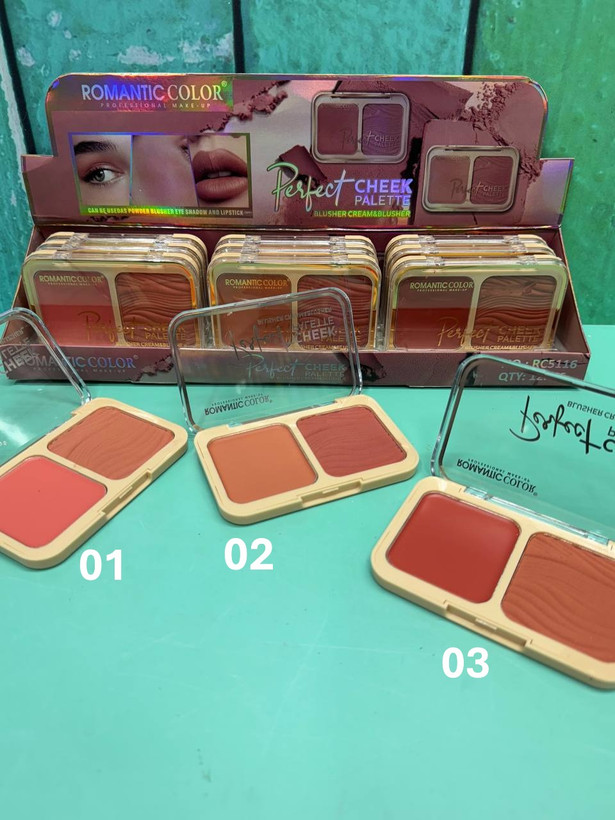 رژ گونه رمانتیک کالر که به صورت پک دو تایی عرضه میشود و یک سمت چرب و سمت دیگر پودری است .